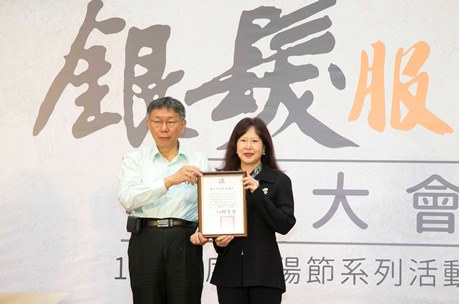 代表領獎的永慶慈善基金會副執行長林麗華表示:「隨著台灣高齡化問題越來越嚴重,銀髮照護是所有台灣人都應該重視的議題。永慶慈善基金會長期與臺北市政府社會局合作,扮演社區中重要的福利窗口,與社會局共同照顧轄區內之弱勢與獨居長者,推動愛心餐食、弱勢送餐、民生物資募集等計畫;同時連續6年響應臺北市政府社會局『溫馨年菜,愛心快遞』,送年菜至行動不便之低收入戶、獨居長者及弱勢家庭中;長期贊助臺北市政府重陽敬老活動,鼓勵長者多多走出戶外,享受健康人生,讓長者們持續感受到我們推廣敬老崇孝的用心。」臺北市長柯文哲(左)頒發謝狀,感謝永慶慈善基金會對長者的關懷。永慶慈善基金會副執行長林麗華(右)代表接受